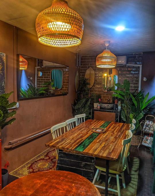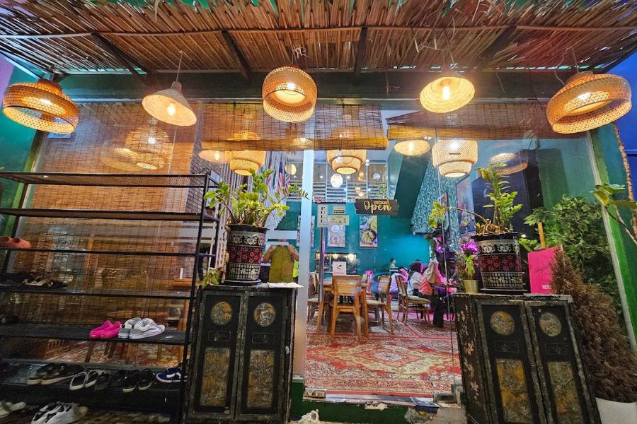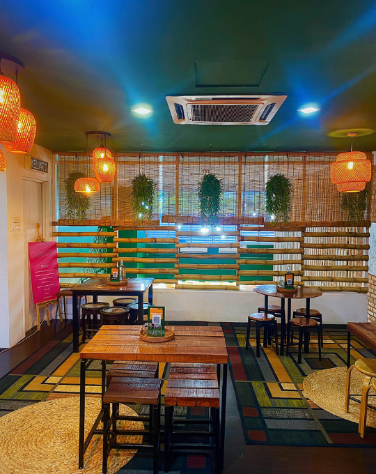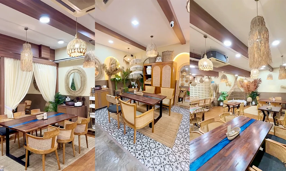 The café interiors are as much a reason to visit as the menu. Designed with woven rattan textures, warm lighting, and lush greenery, the space feels like a tropical hideaway in the middle of the city.